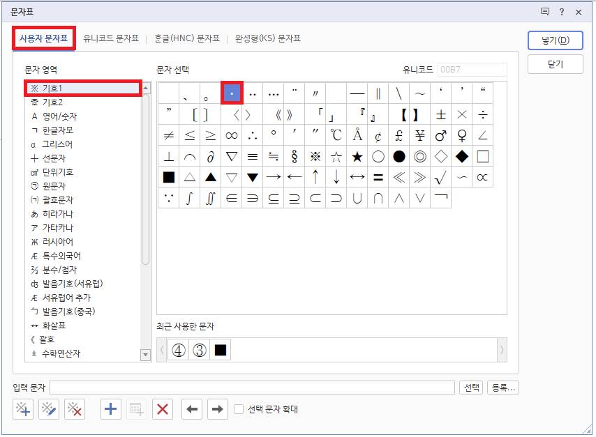 한컴오피스에서 "Ctrl + F10"을 누르면 아래와 같은 다양한 문자기호를 사용할 수 있는데 찾는 방법은 사용자 문자표 > 기호 1 > 4번째 기호를 선택해 주면 된다.