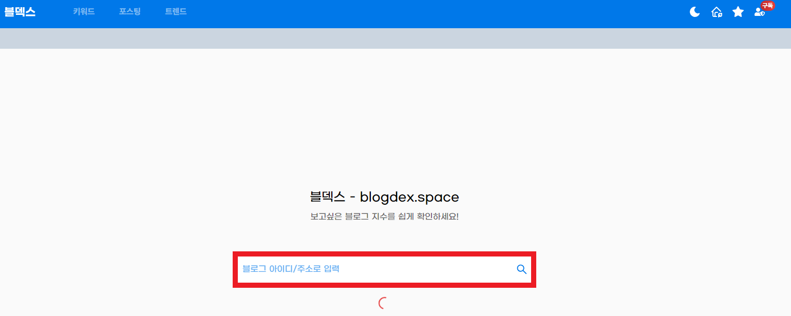 1. 블덱스 홈페이지에 접속한 다음 로그인 해준다. 이후 나오는 화면에 블로그 아이디를 입력하고 돋보기를 클릭해 준다.