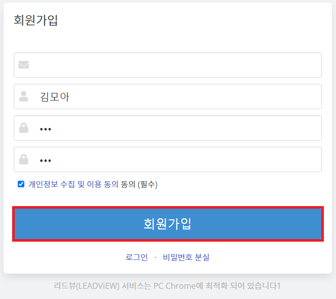 2. 그럼 회원가입을 먼저 하라고 뜨는데 리드뷰 사이트는 결제 없이 무료로 단 한 개 아이디의 블로그만 확인이 가능하다.