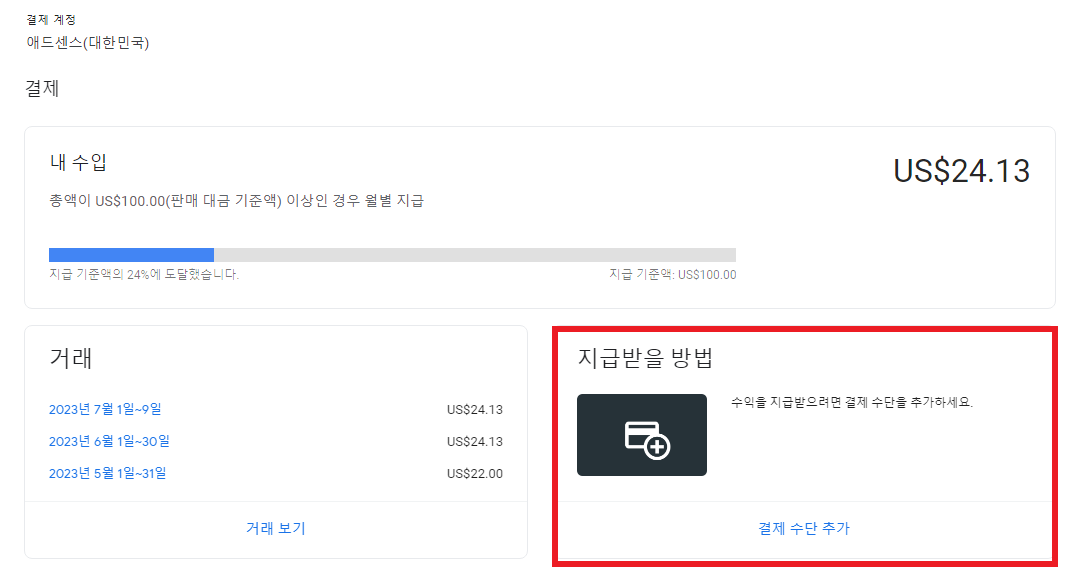 2. 그럼 아래와 같은 이미지가 보이는데 여기서 [지급받을 방법]에 [결제 수단 추가]를 클릭해 준다.