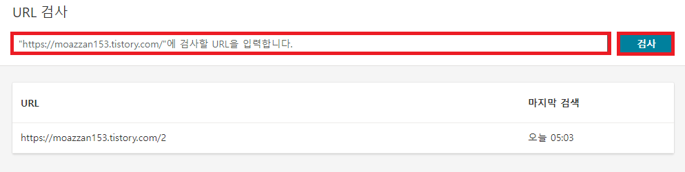 2. 그럼 이렇게 URL 검사를 진행할 수 있게 URL을 입력하는 란이 나온다. 친절하게 URL입력 형식까지 적혀있다. 페이지 주소를 숫자로 선택했다면 [https://********. tistory.com/1] 이런 식으로 입력하고 검사를 클릭해 준다.