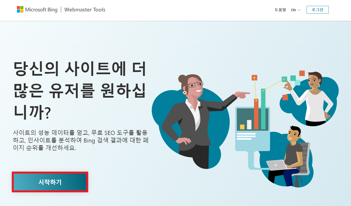 1. Bing Webmaster Tools 사이트에 접속한다음 시작하기를 클릭해 준다.
