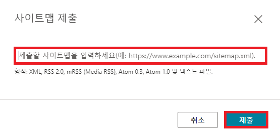 4. 본격적인 사이트맵 제출 방법이다. 왼쪽 메뉴바에 [사이트맵]을 클릭한 다음 [사이트맵 제출]을 클릭해 준다. 그럼 아래 같은 사이트맵 제출 팝업창이 뜨는데 [https://*********. tistory.com/sitemap.xml]의 형식으로 입력해 준 다음 제출을 클릭해 주면 된다. 하는 김에 [https://*********. tistory.com/rss]도 같이 제출해 준다.