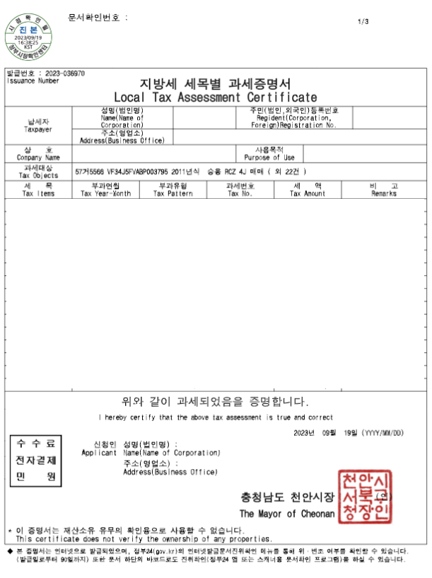 발급문서의 납세의무자 주소는 신청 시 입력한 주소와 상이할 수 있다.